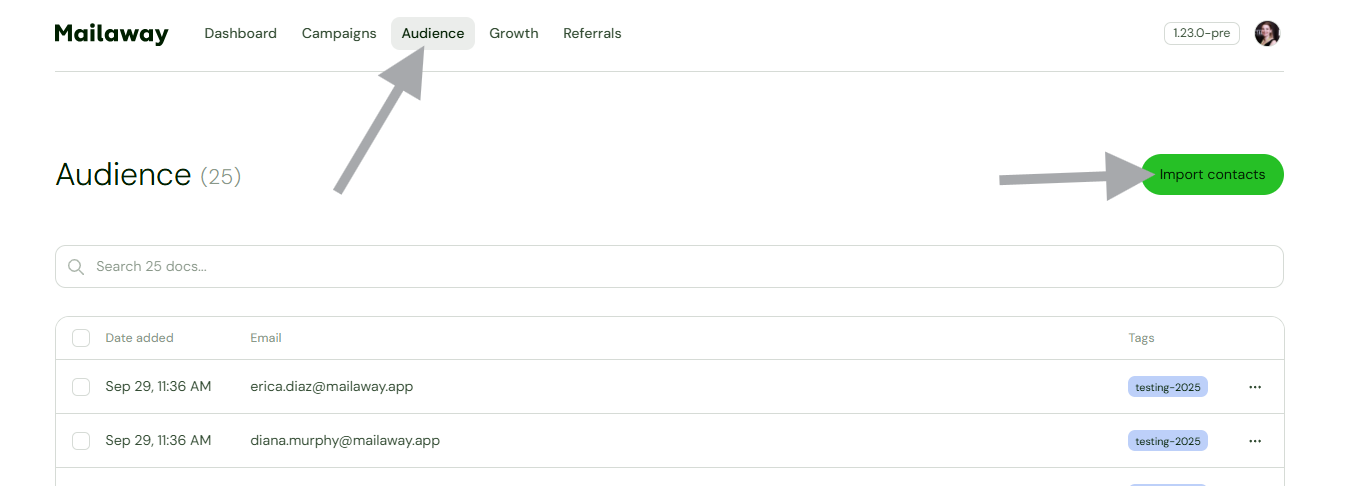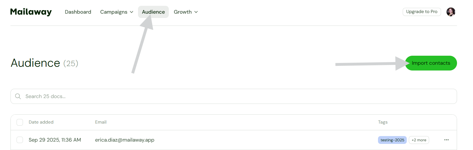 Right after onboarding, you'll be able to go to Audience and start importing your contacts.