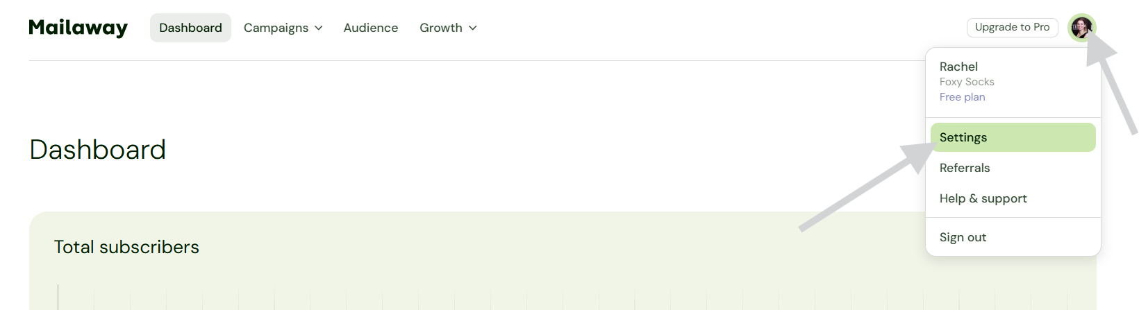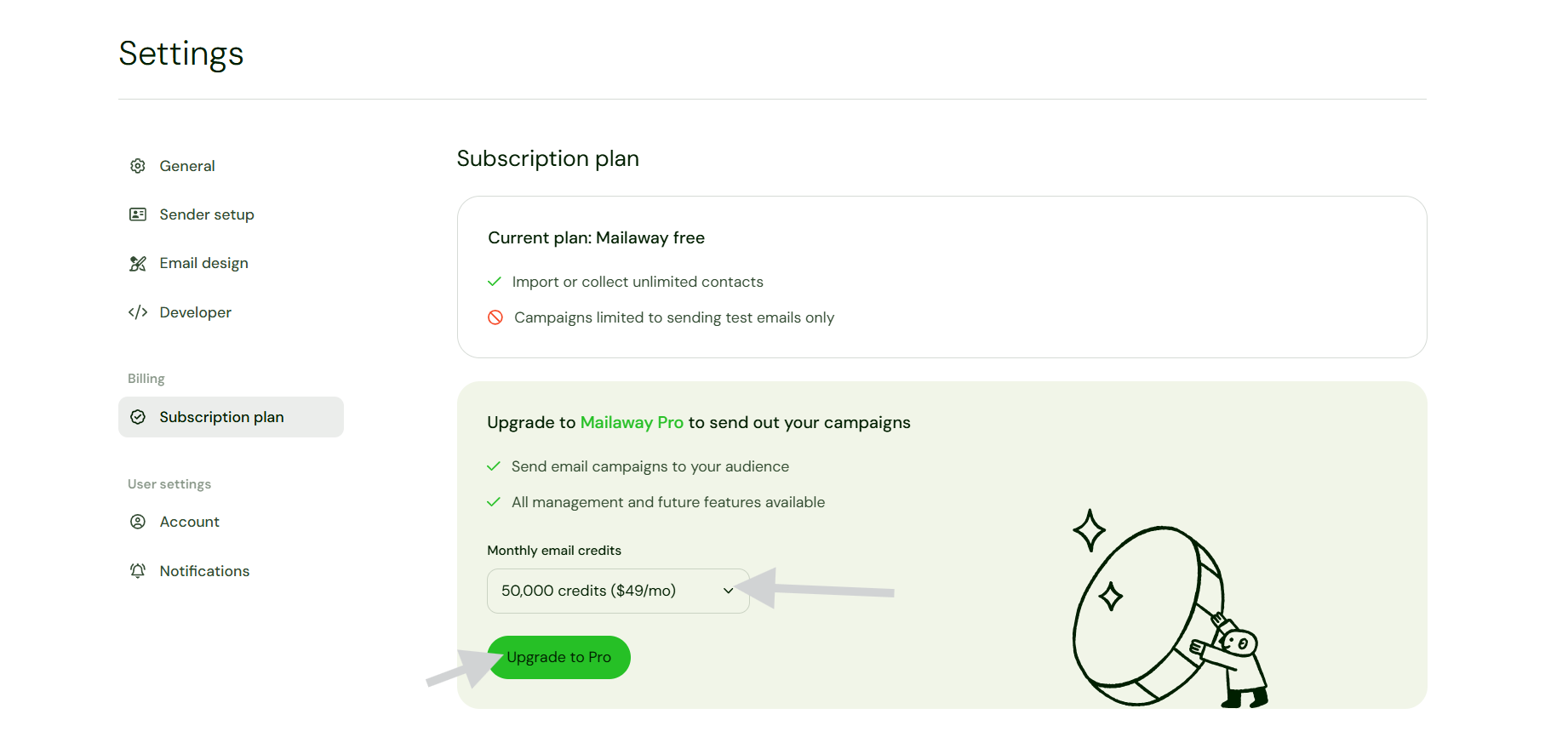 Once you're ready to contact your subscribers and send them mail, you'll upgrade from Free to the paid version of Mailaway.