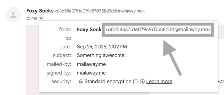 By default, you'll have a Mailaway sending address that consists of a unique string of numbers and letters. The name used will be your Business name you added. You can see an example below.