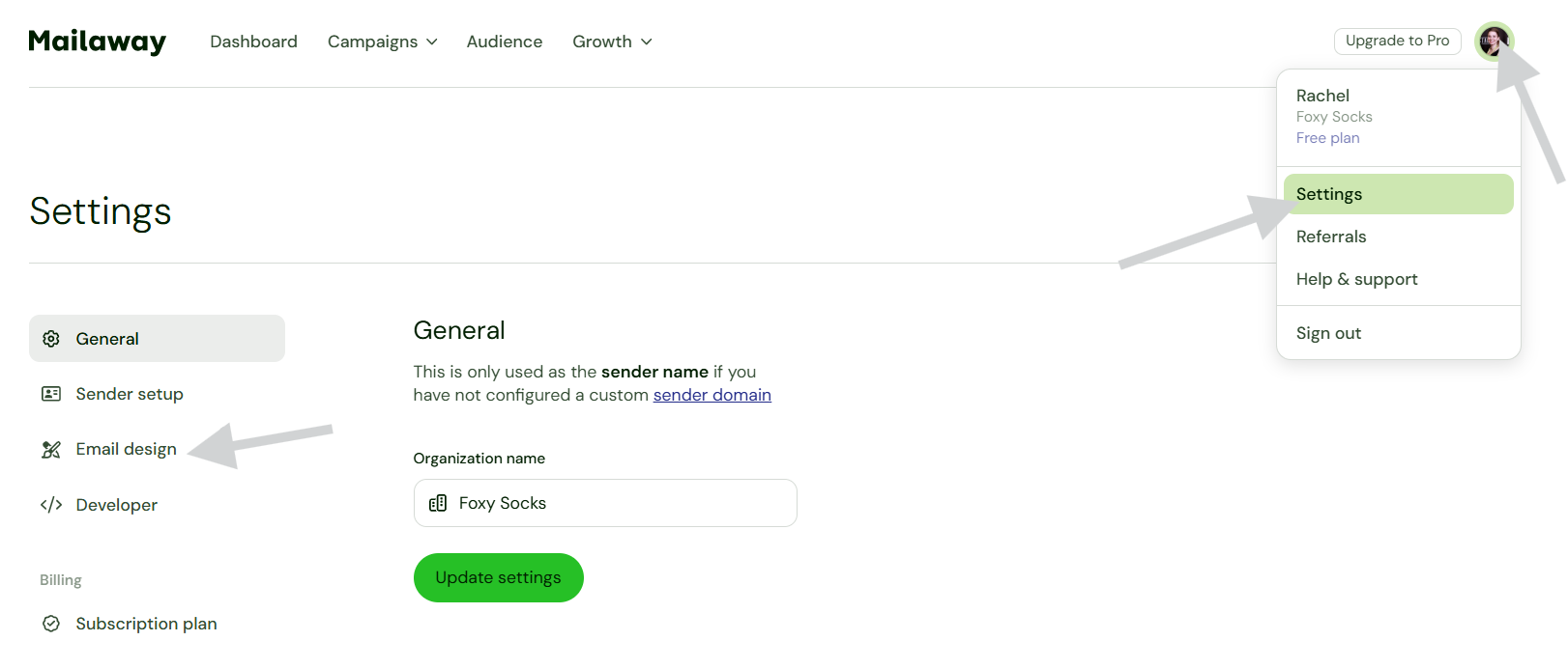 When you first sign up for a Mailaway account, you'll be able to customize your email design and add your Business name and logo. You'll then see this design when you create campaigns.